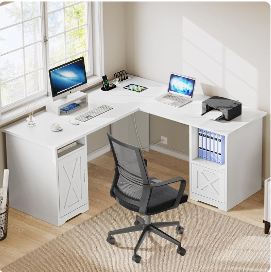 DWVO L Shaped Desk with Power Outlets, 60 Inch Computer Desk Corner Desk with File Drawer, Home Office Desk with Monitor Stand & Storage Shelves, L-Shaped Desk with File Cabinet