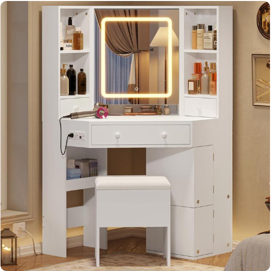 Sikaic Corner LED Makeup Vanity Desk With Storage Stool And Charging Station Mirror Drawers, Rotating Shelves Vanity Desk with Adjustable Lights Cabinets Bottles Cosmetics Furniture Bedroom
