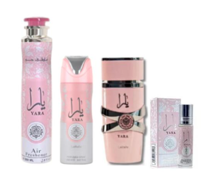 Yara Perfume (3.40z) + yara Deodorant (6.67oz) + yara Air Freshener (10.0 oz) + yara rollon 10ml(0.34oz) from lattafa Perfumes (unisex)
